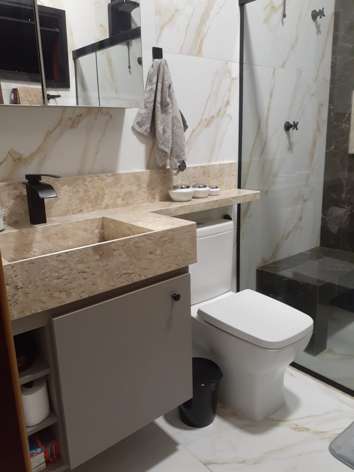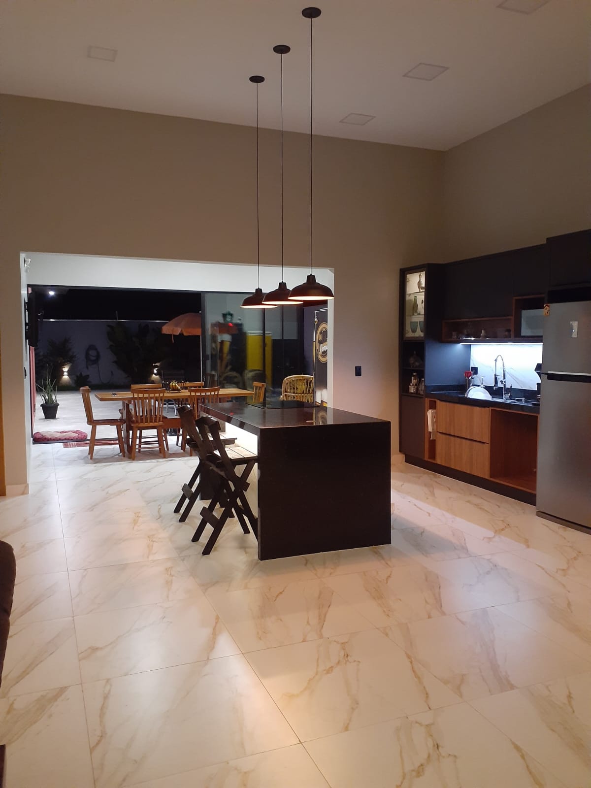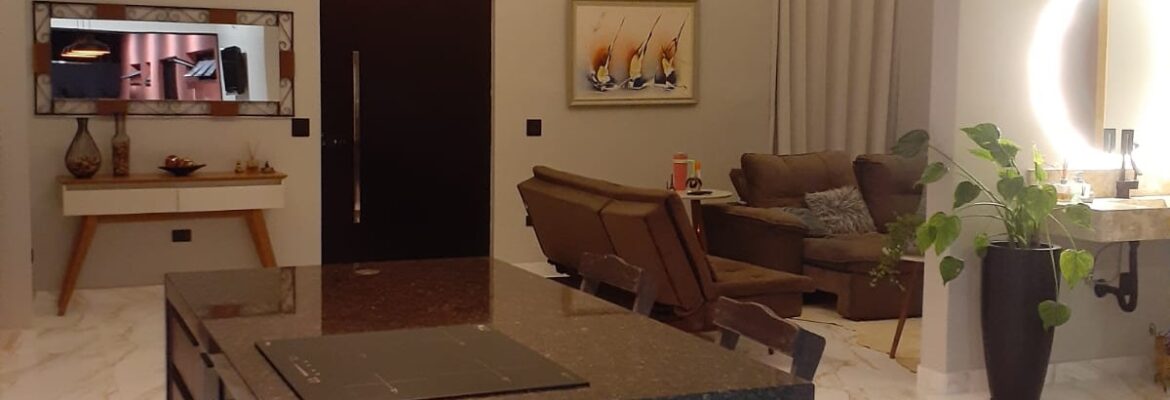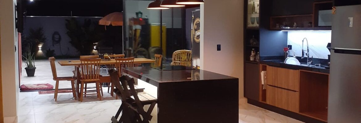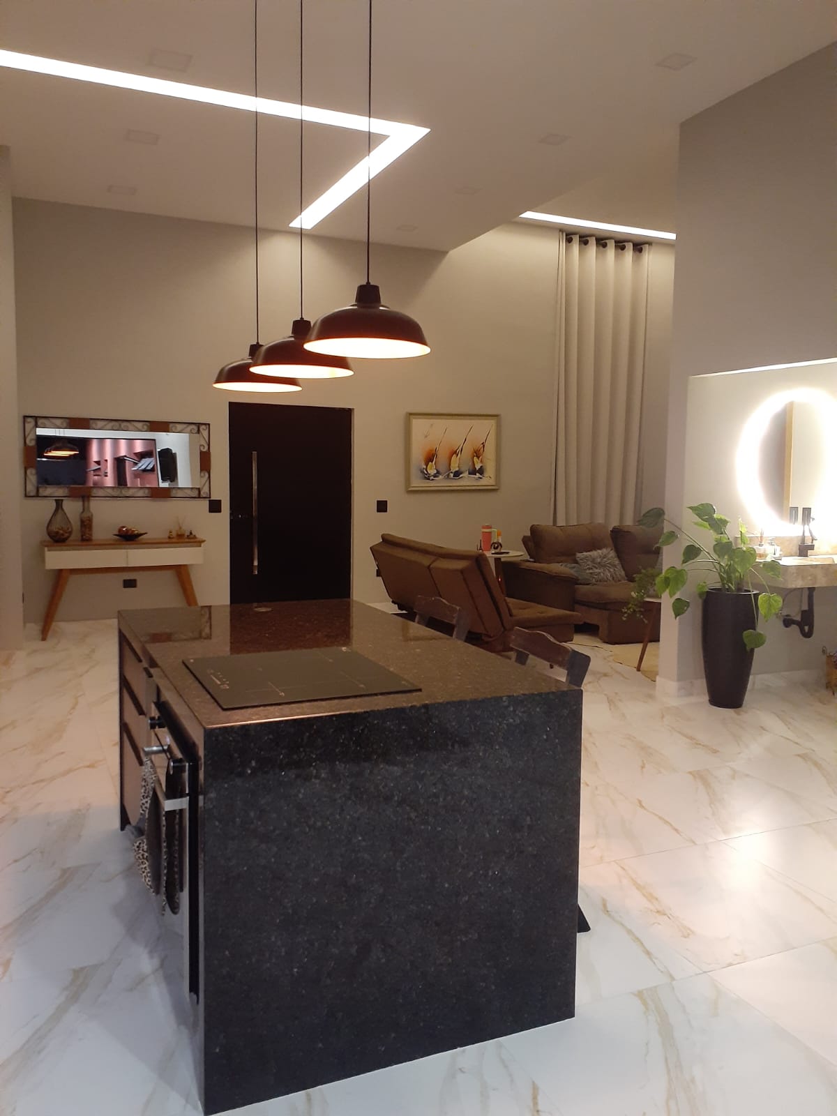 - Cozinha moderna com ilha, totalmente integrada à sala de estar e TV