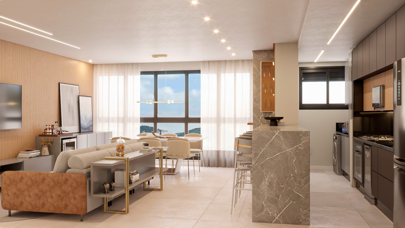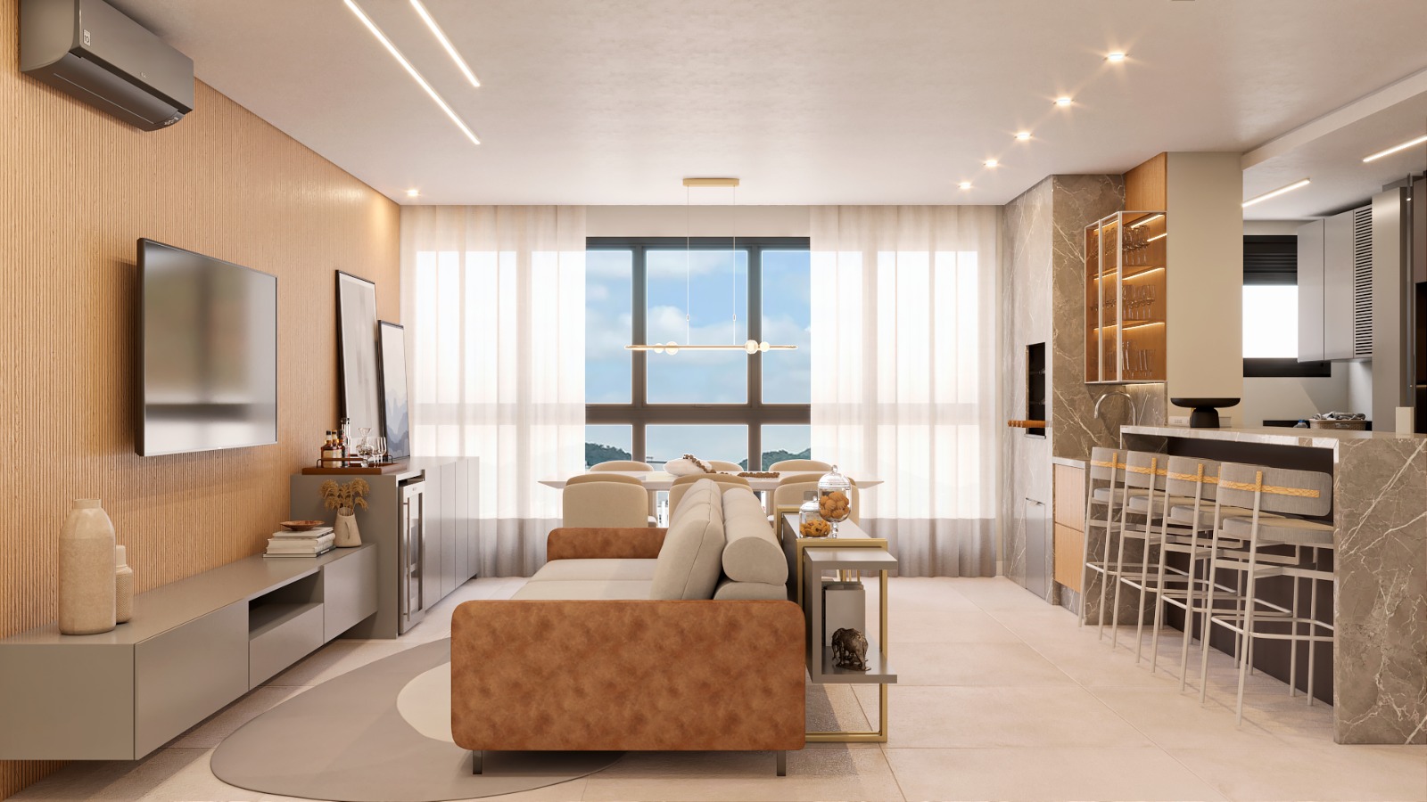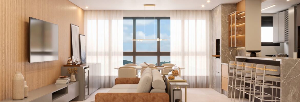 • Living integrado com sacada e churrasqueira a carvão
