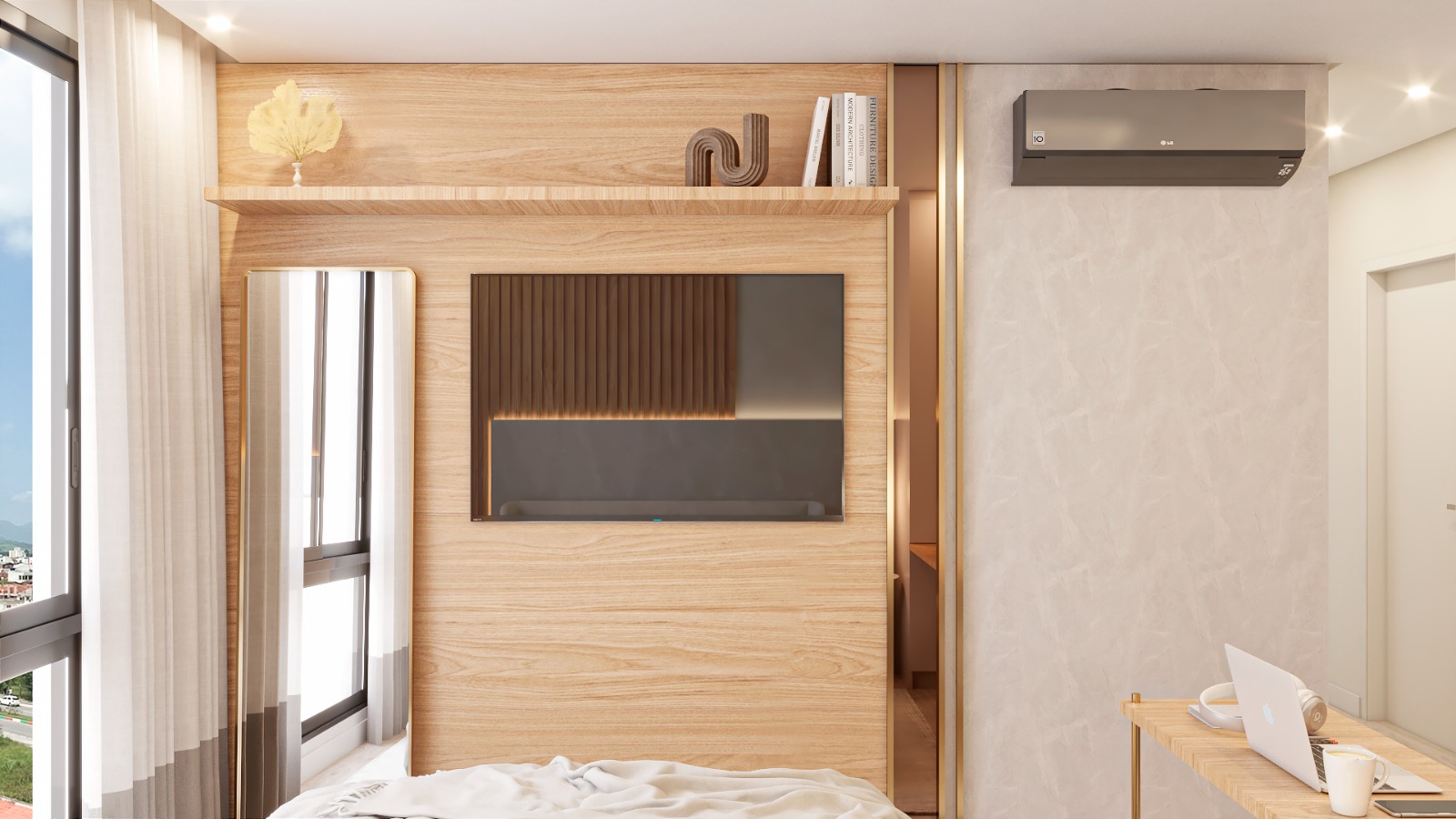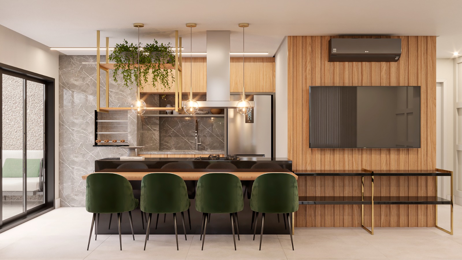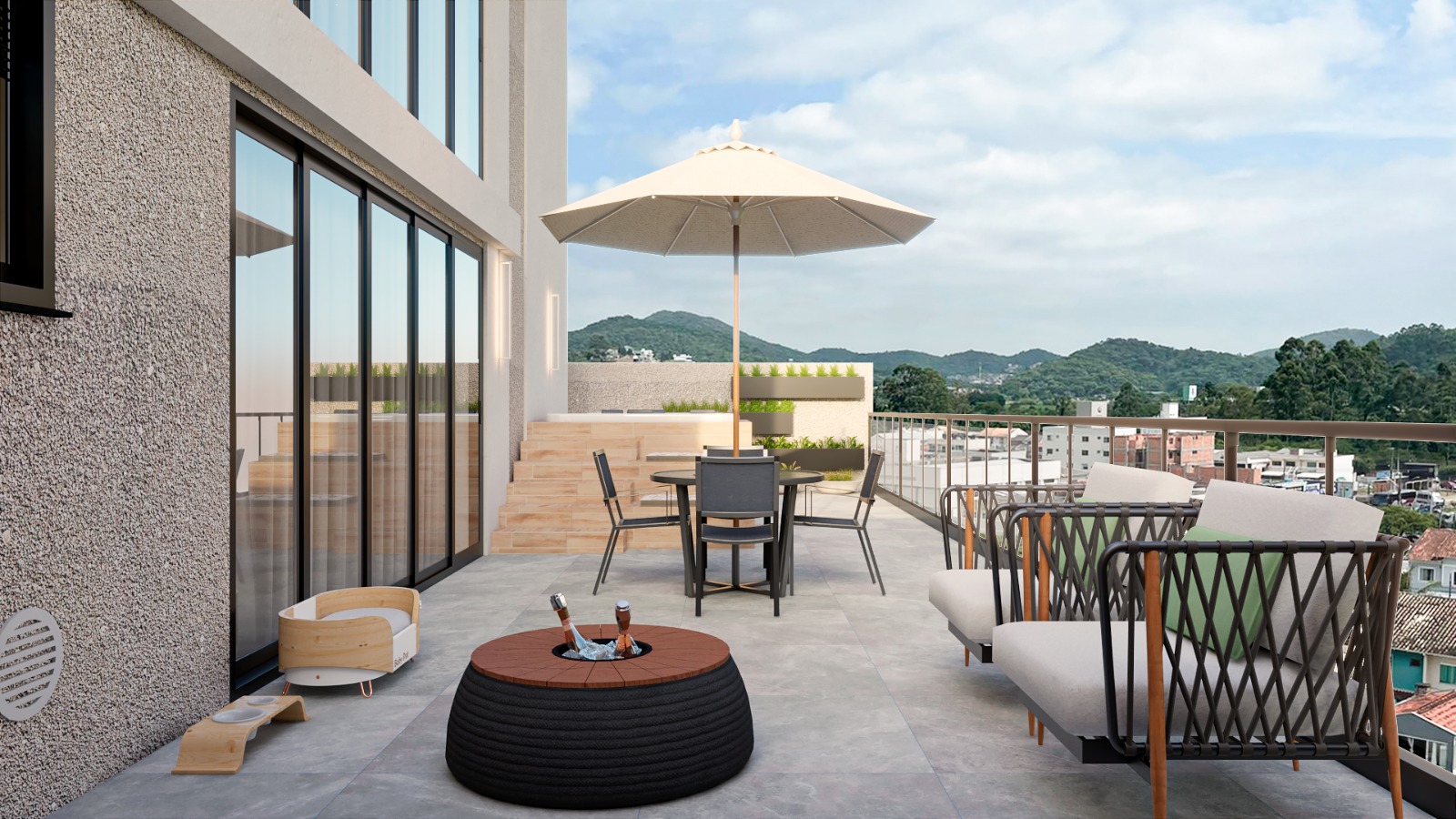 • Living integrado com sacada e churrasqueira a carvão