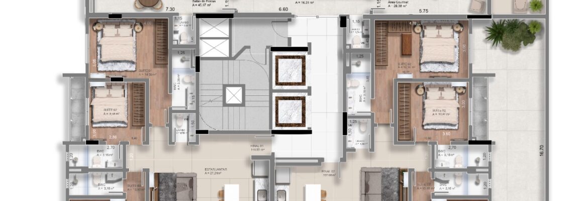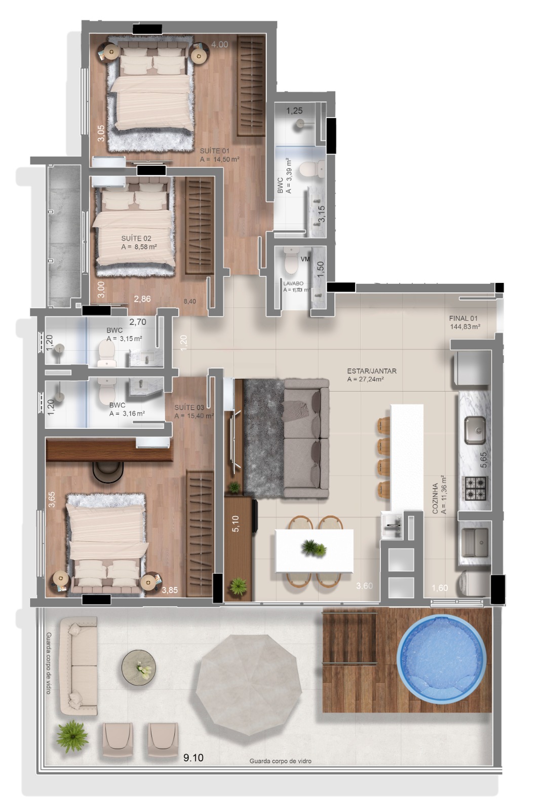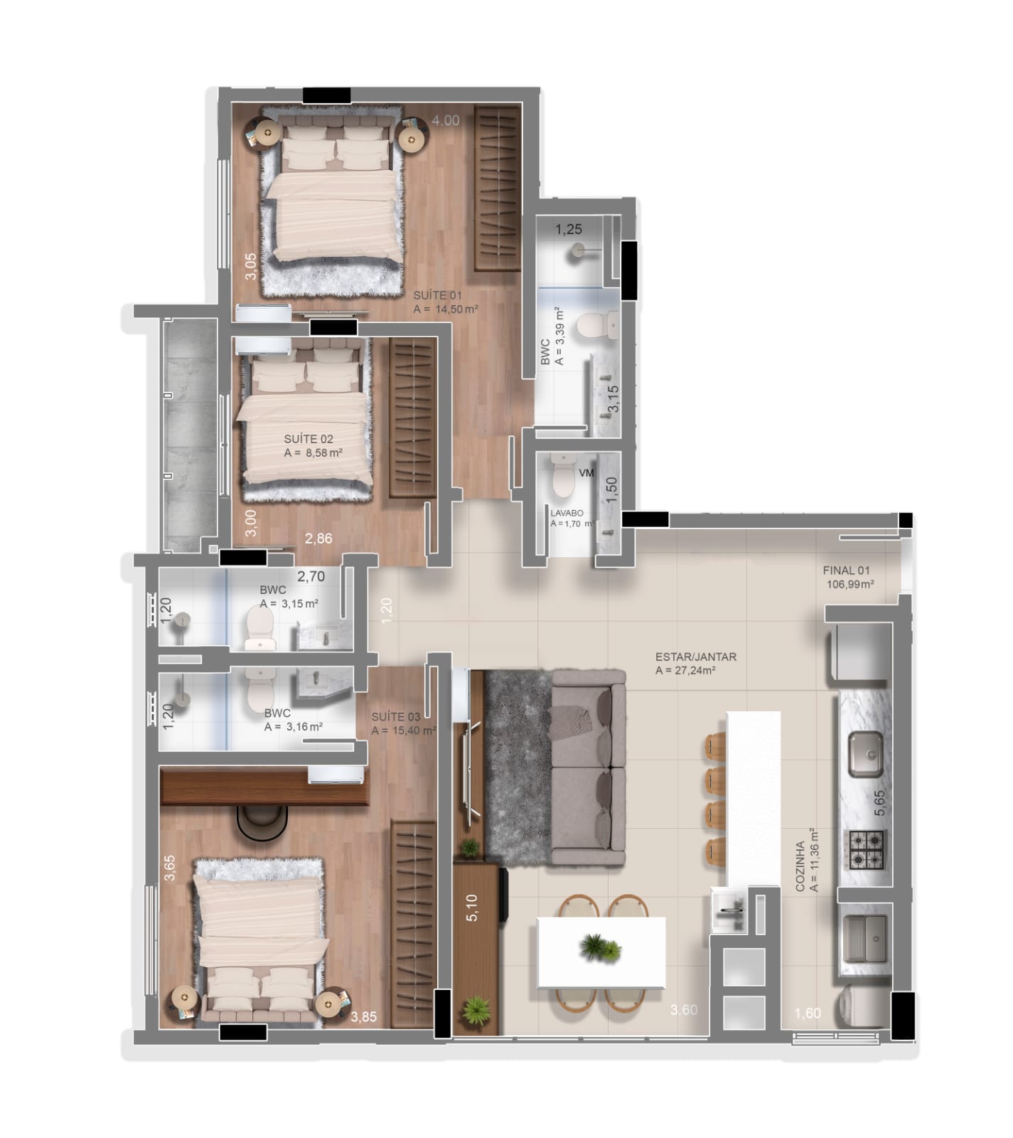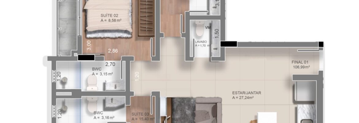 TIPO 1: 🛏️🛏️🛏️ 3 suítes + Lavabo com 107m²