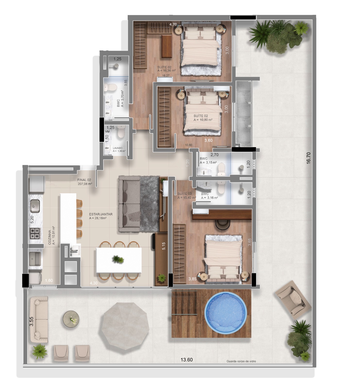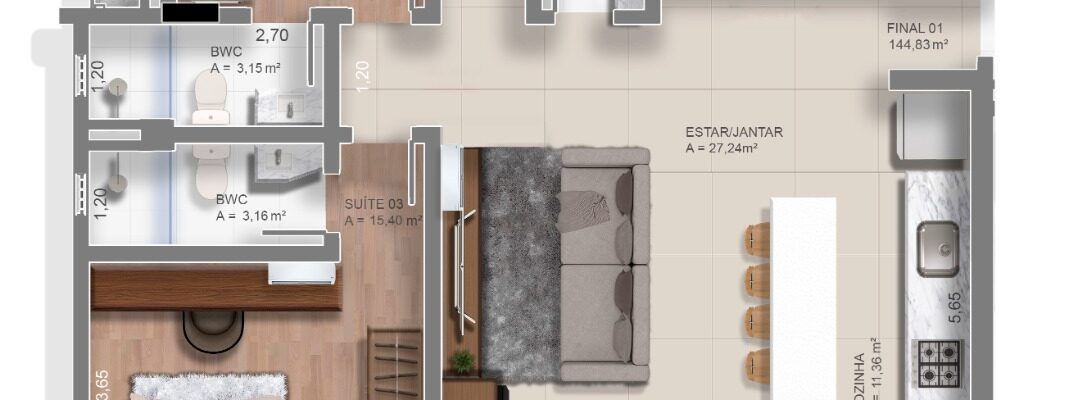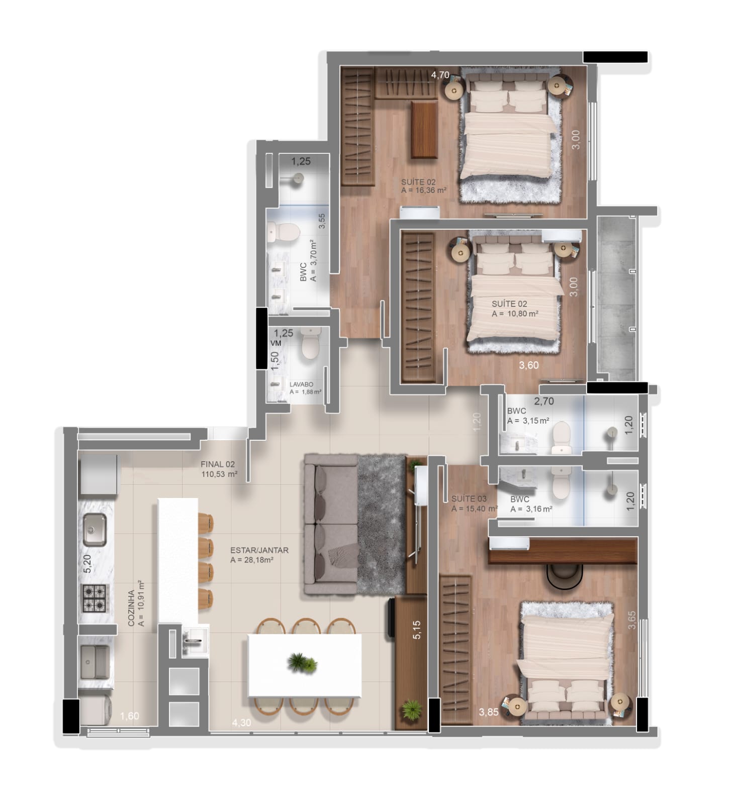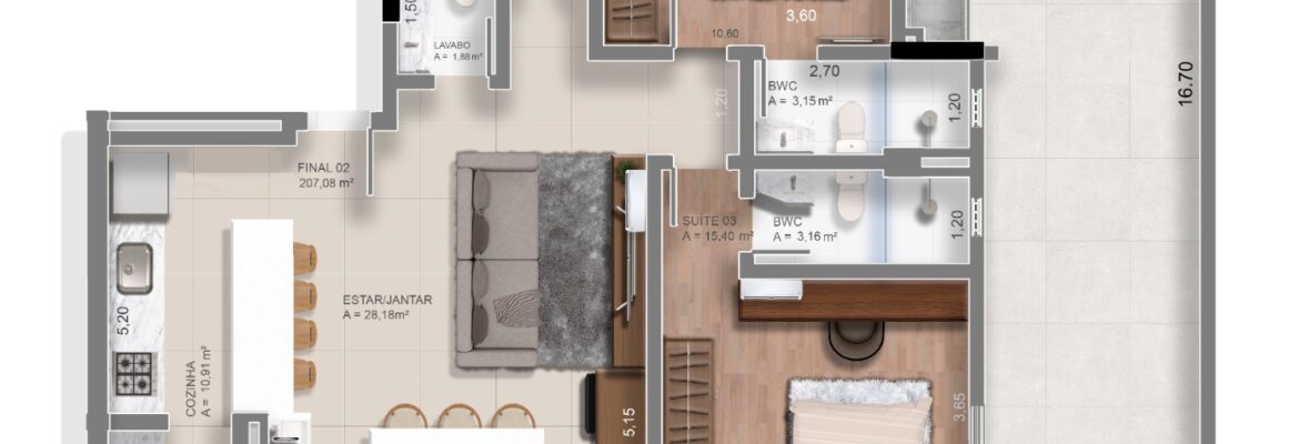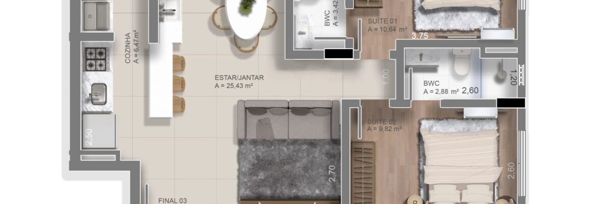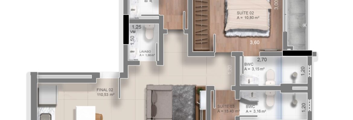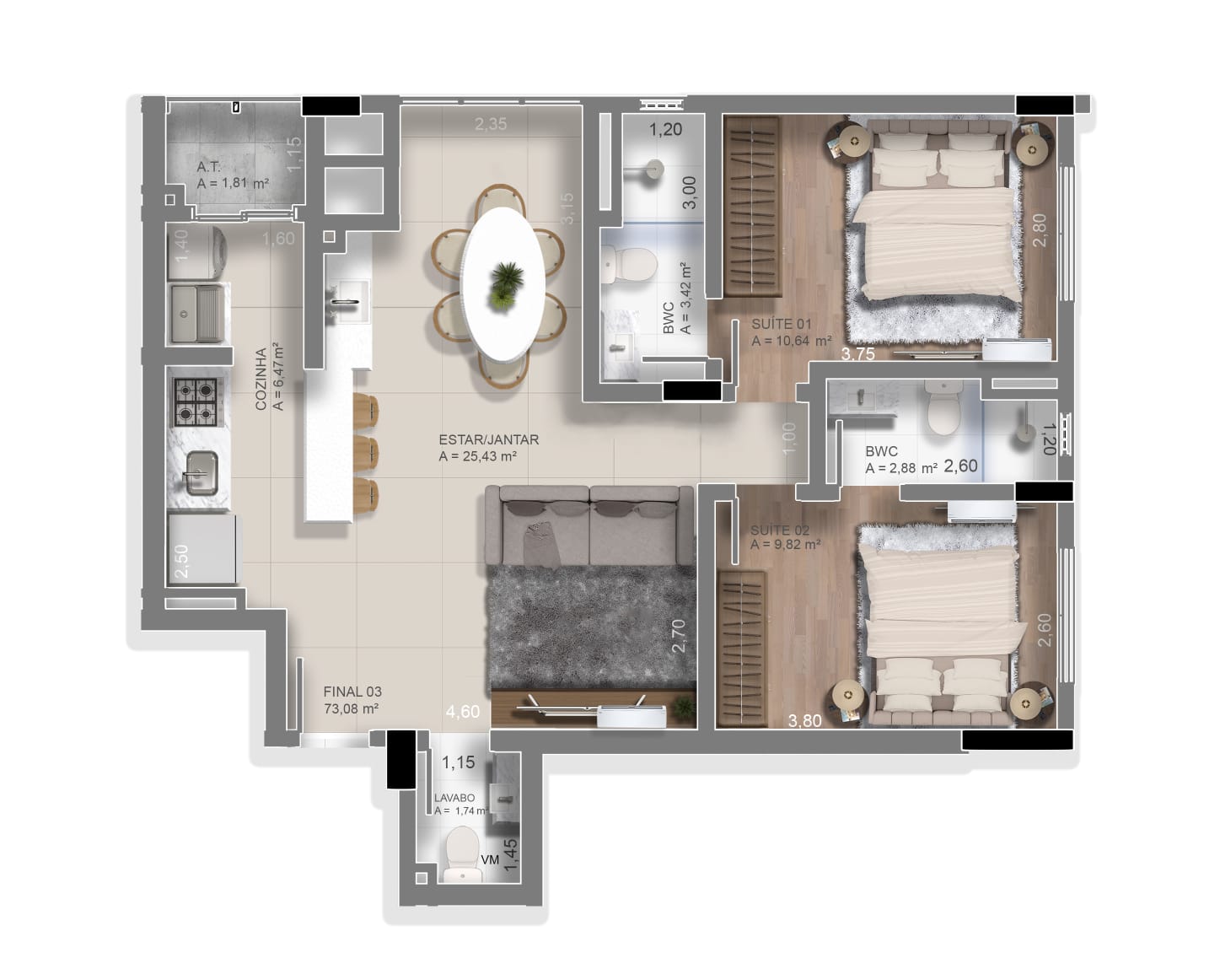 TIPO 3: 🛏️🛏️ 2 suítes + Lavabo com 73m²