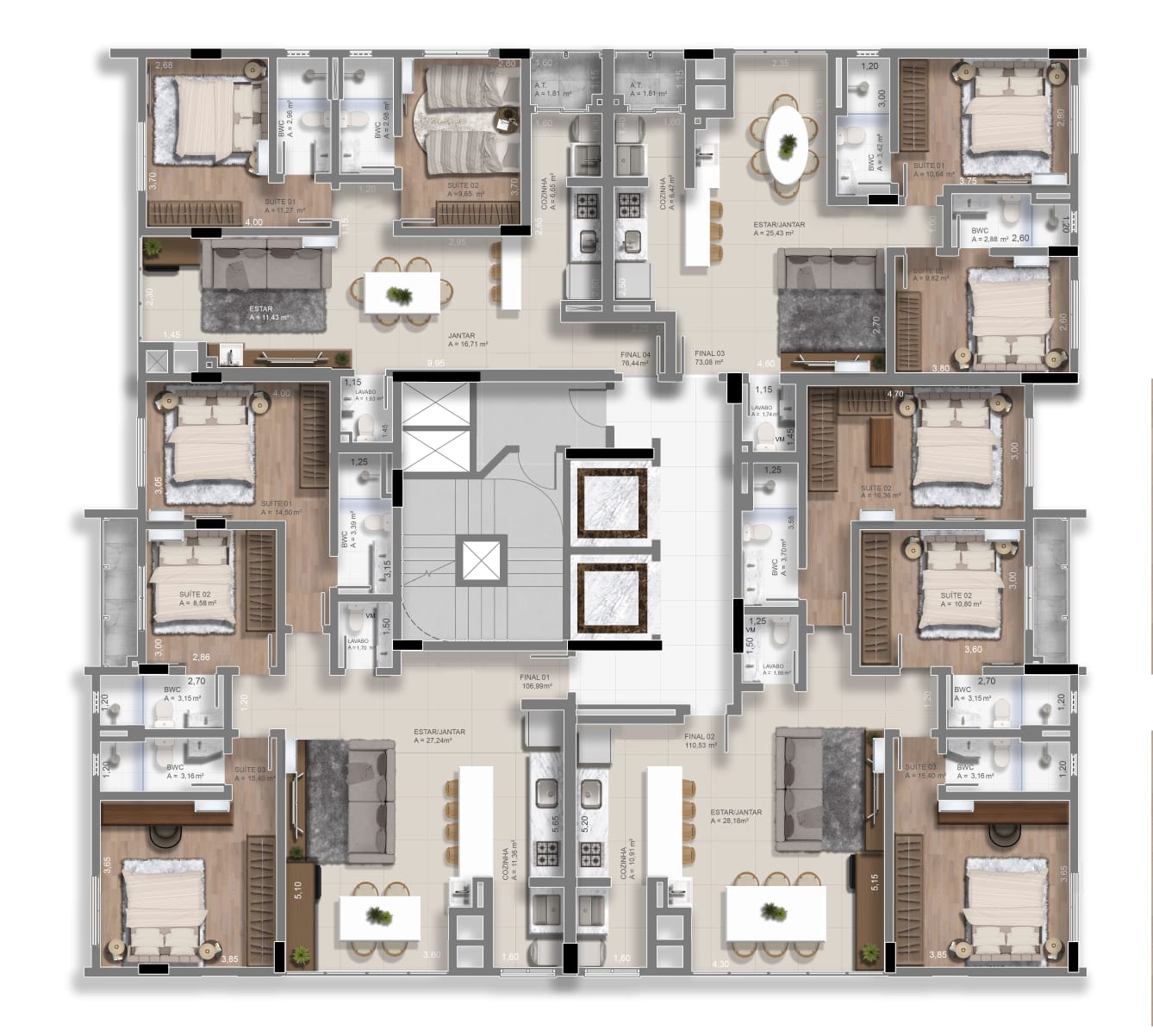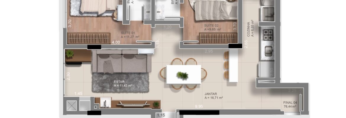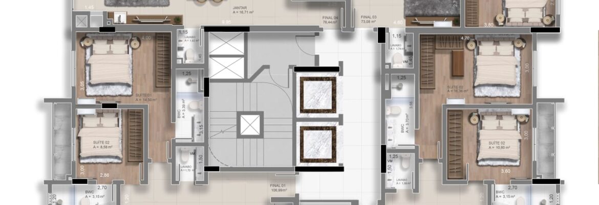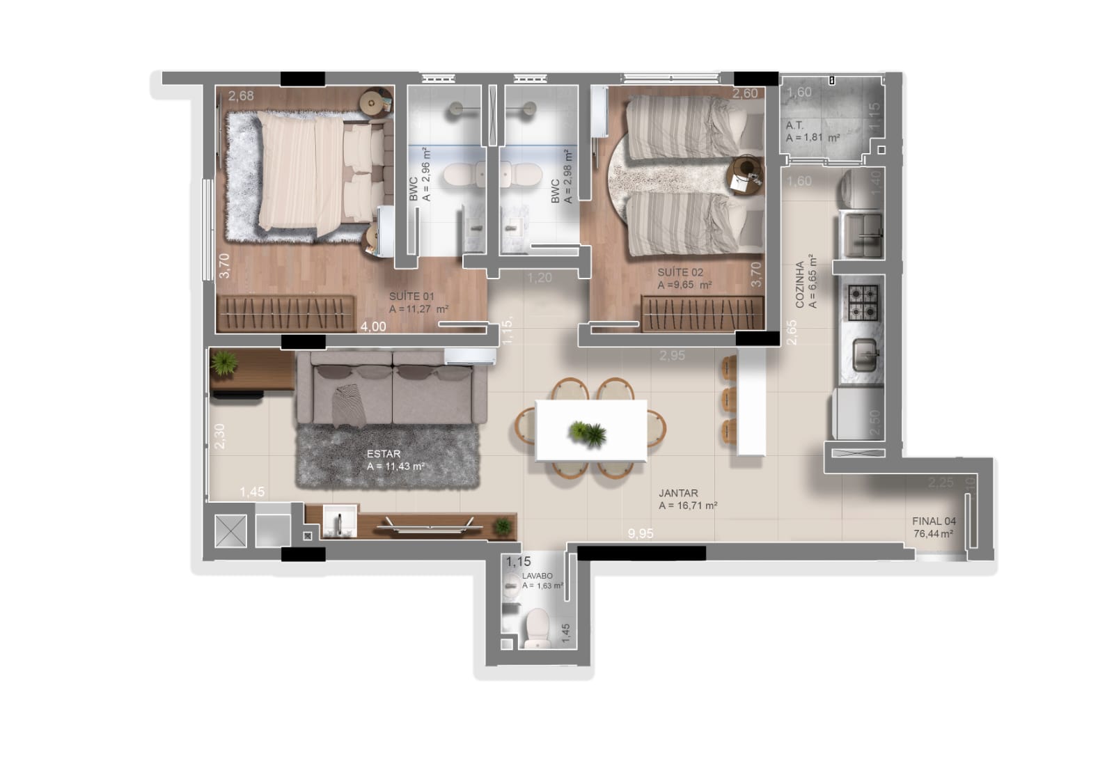 TIPO 4: 🛏️🛏️ 2 suítes + Lavabo com 76m²