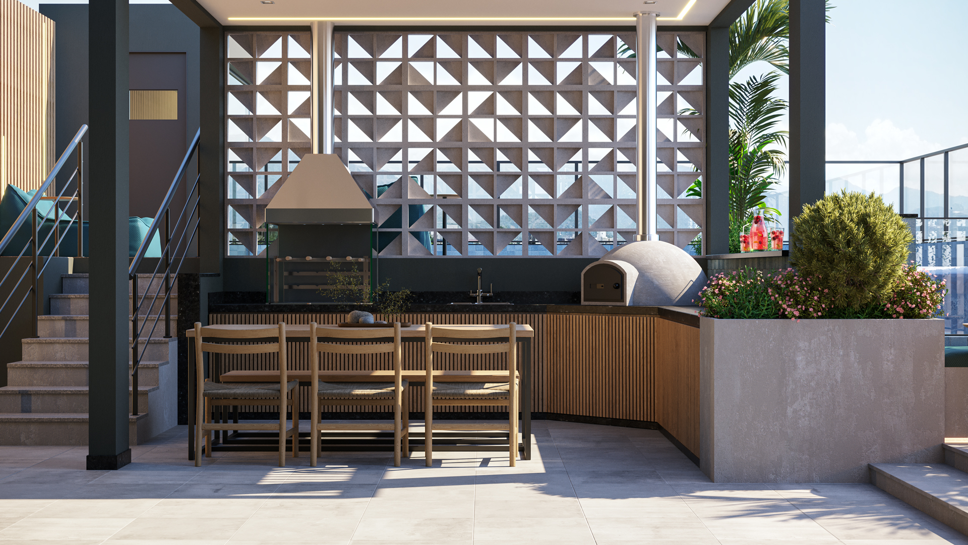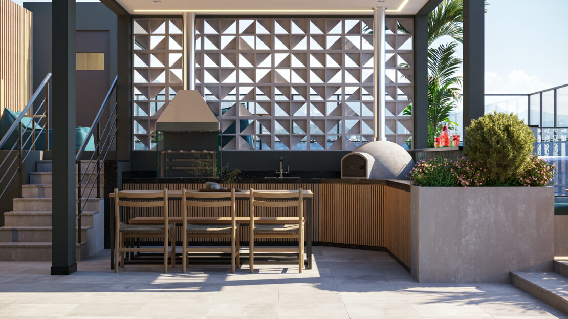 ✅ Estação gourmet com forno de pizza, churrasqueira e conexão para bebedouro