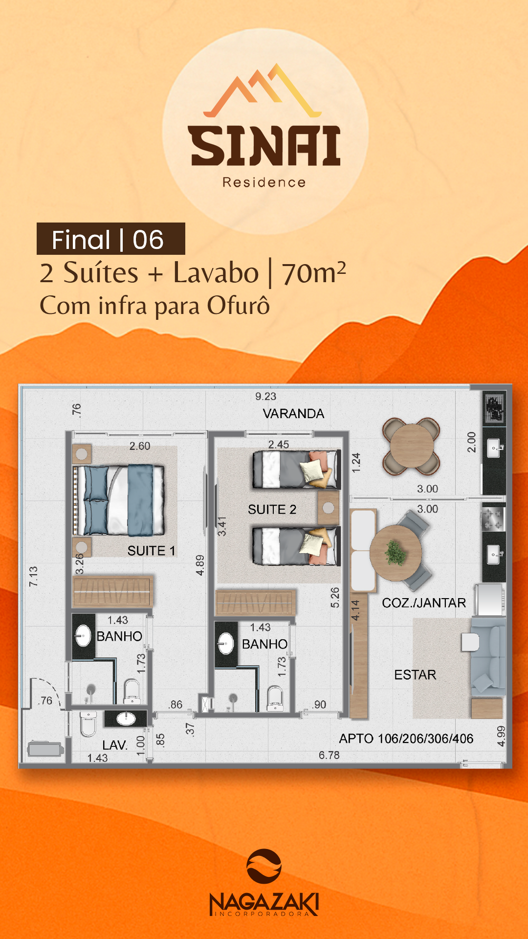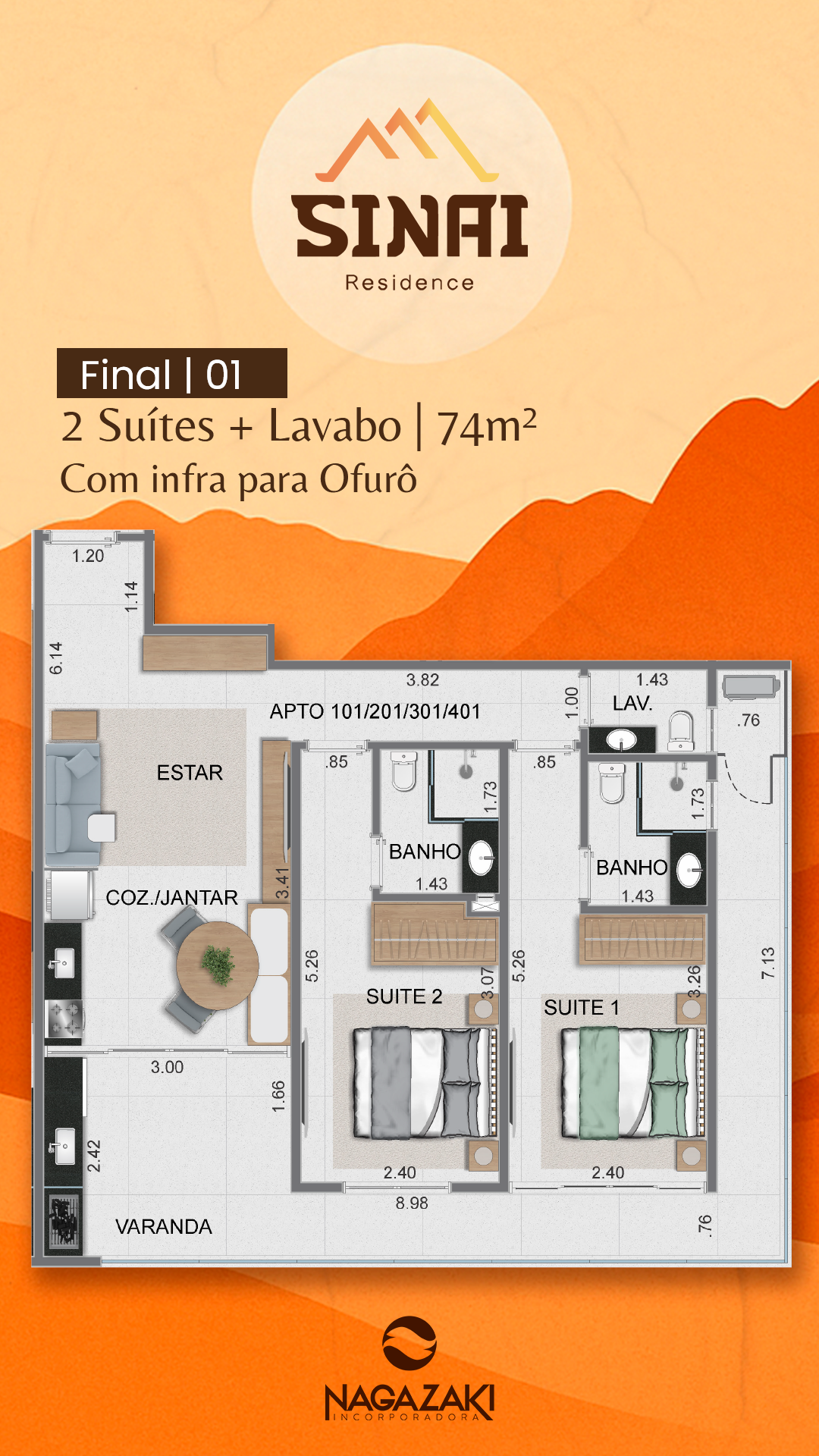Apartamento tipo final 1, 4, 6 e 7: 74m², 76m², 70m², 72m²