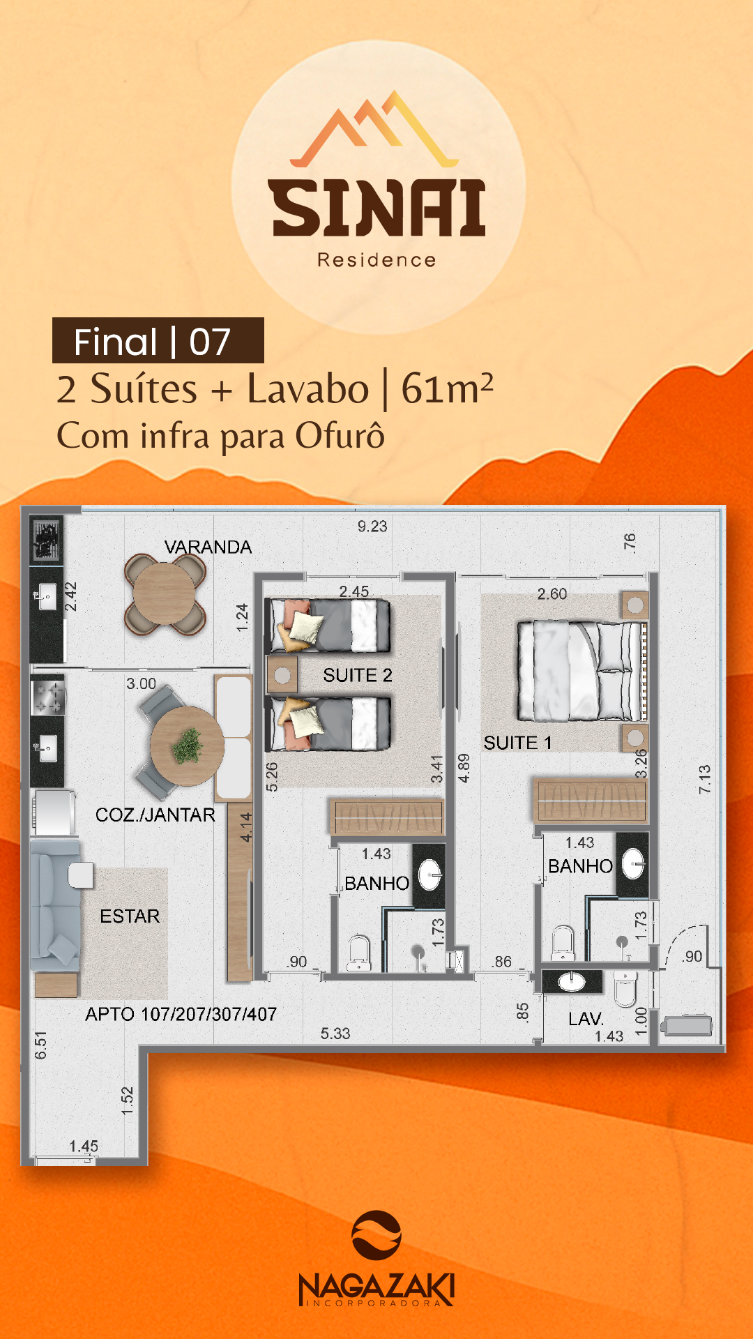 Apartamento tipo final 5 e 8 com: 60m² e 61m²